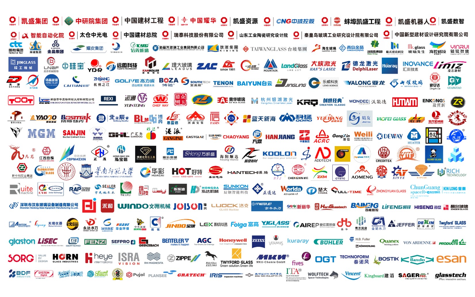 Một số doanh nghiệp tham gia triển lãm có thể kể tên như Tập đoàn Vật liệu Xây dựng Quốc gia Trung Quốc, Công nghệ Triumph, Tập đoàn Xinyi, Tập đoàn Shanghai Yaohua Pico, Tập đoàn CSG, Tập đoàn Kính Đài Loan, Tập đoàn Jinjing, Glaston, LiSEC, Vonardenne, Quanex, SIEMENS, Schneider, Bottero, Honeywell, Sefpro và các doanh nghiệp kính Trung Quốc và quốc tế khác.