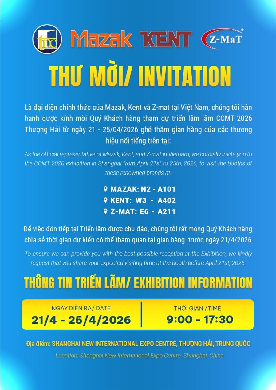 Trong không khí sôi động của sự kiện đẳng cấp này, với tư cách là đại diện chính thức của các thương hiệu hàng đầu thế giới bao gồm Mazak, Kent và Z-mat tại Việt Nam, chúng tôi hân hạnh được kính mời Quý Khách hàng đến tham dự triển lãm CCMT 2026.