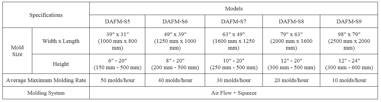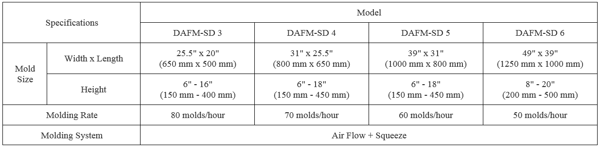 DAFM series utilizes the SEIATSU Air-Flow Sand Filling Technology for producing larger molds with high density and uniform hardness.