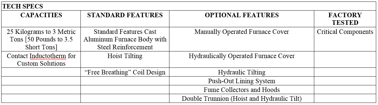 Dura-Line® induction melting furnaces are ideal for when you want big furnace features in a midsize induction furnace melter. These efficient and reliable induction melting furnaces offer high operational efficiency with a wide choice of capacities in a budget-friendly package.