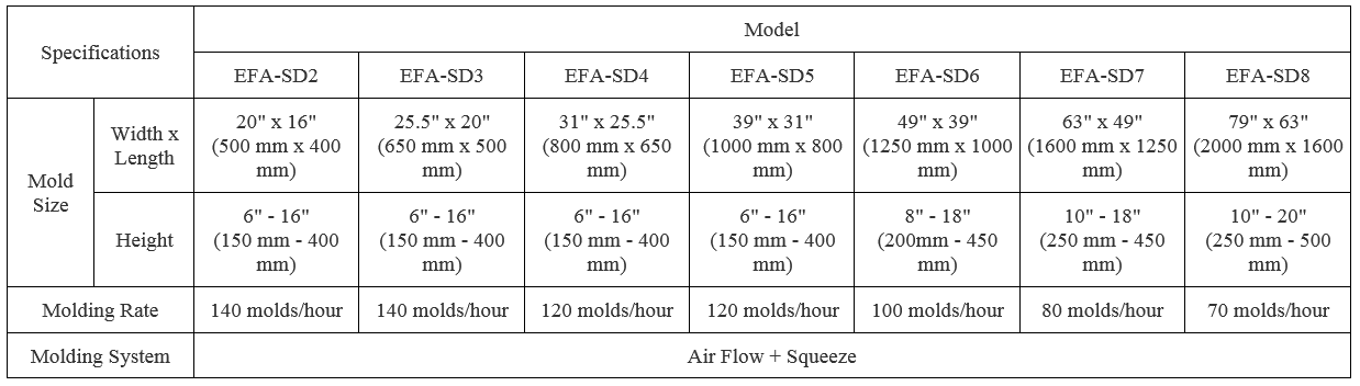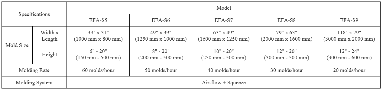 EFA utilizes the SEIATSU Air-Flow Sand Filling Technology for producing larger molds with high density and uniform hardness.