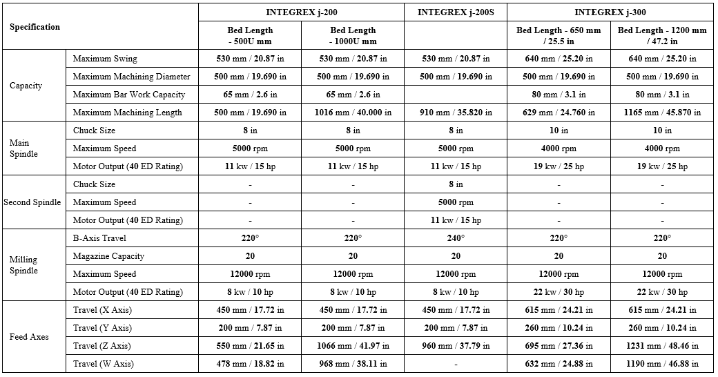 The INTEGREX j-Series Multi-Tasking Machines perform 4-axis simultaneous machining with 5-axis tool tip positioning for significant advantages in productivity, accuracy and flexibility. The j-Series provides an option for increasing processing flexibility and productivity with Multi-Tasking technology and tool changing capability, while providing a reasonable price alternative for those shops that want automatic tool changing capability but do not necessarily need simultaneous 5-axis machining capability.