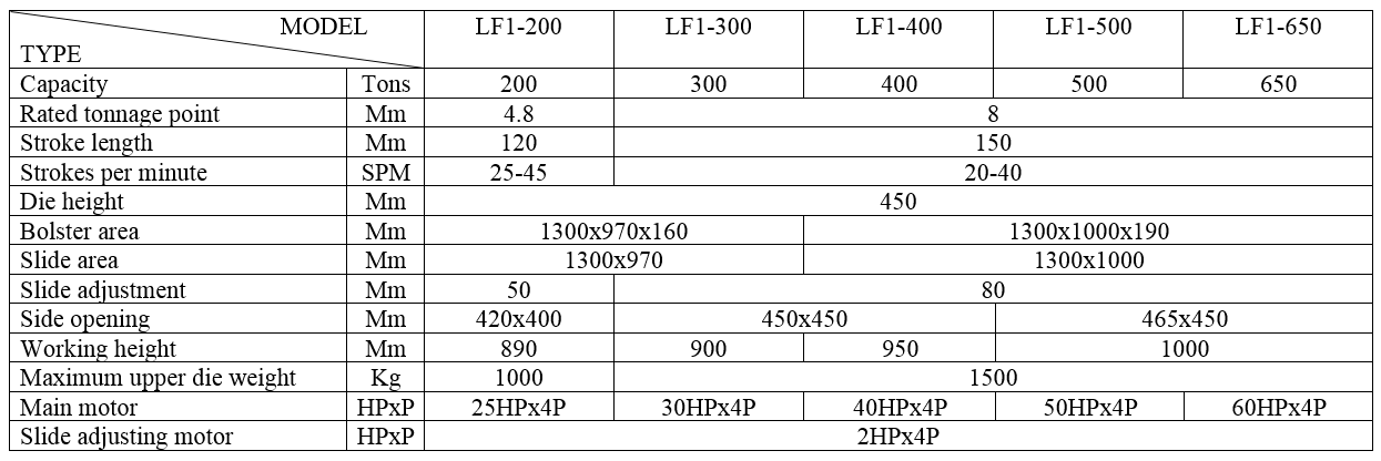 LF1 series is link motion with knuckle joint transmission structure creates a unique slide motion curve which is able to extend the time for forming. This slide motion is ideal for complex sheet metal forging. Extend the time at bottom dead center (BDC), in order to process Fine Blanking, Near-net-shape and Press Forging, Unique Slide Motion prevents “spring back†of materials, and also creates better forming and productivity.