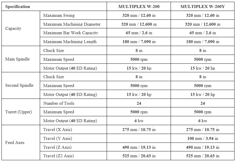 The MULTIPLEX W Series of CNC turning centers provide Multi-Tasking capability with dual-spindle/dual-turret machine configurations for mid-sized lot production. Both spindles can be used to efficiently machine the front and back sides of parts, including milling, for DONE IN ONE®, single-setup production. Both turning spindles are identical in performance and can also be used to simultaneously cut two parts at one time. Their synchronized rotation delivers high-accuracy for operations like shaft work.