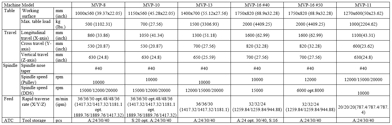 +Drain through built-in on working table. Incorporated oil fluid separation on casting design +Eco-friendly design. Efficient oil and fluid separation incorporated on casting design prevents cutting fluid deterioration. 1600mm oversized base +One piece Meehanite casting which is stable, rigid and rugged. To ensure maximum rigidity, the MVP-8 and MVP-10 are built on heavy duty Meehanite casting. Also, all axes are reinforced to provide upper most rigidity and stability. φ50 ballscrews on 3 axes(MVP-13) +All ballscrews are center mounted and supported on both ends by high precision angular contact thrust bearing. All servo motors with absolute encoders for increasing efficiency and dependability. (FANUC and Mitsubishi only) |