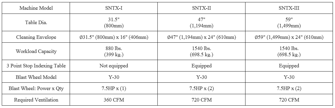 The SNTX table blast system provides superior coverage of your parts during the blasting process. The unique 3-position turntable indexes to front, center and rear of the blast pattern to provide varying blast projection angles during the blasting process. This feature significantly reduces the need to reposition parts halfway through the cycle and provides an overall better cleaning operation.