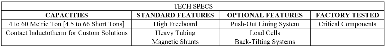 Due to our superior design and technological expertise, Inductotherm Steel Frame Furnaces are more efficient and easier to maintain than competitive furnaces. Steel Frame Furnaces feature rugged construction to minimize distortion during tilting and pouring operations. They are designed with a high freeboard and provide extra space for solid charge materials, enabling its cover (optional) to be easily closed as the charge melts, greatly reducing heat loss. The raised hearth (optional) provides a convenient fulcrum for easy slag and dross removal and also acts as a safety barrier for your workers, helping to shield them from excessive heat when the cover is off. The thick-walled tubing in Steel Frame Furnaces has a larger current-carrying cross section than comparably sized tubing so it offers lower resistance. This allows more energy to go into the melt. Every Steel Frame Furnace is designed for its structural strength with the help of specially developed computer-aided software.
