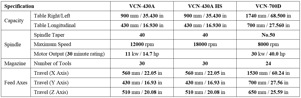 The VCN Series of vertical machining centers are built with more productivity-enhancing features than any other verticals in their class. The series combines advanced technology, productivity and value for a wide variety of machining applications. This makes them an incredible value for shops large and small. Equipped with advanced controls that provides conversational or EIA programming, machines in this series give the capability and productivity necessary for today's technology driven shops.