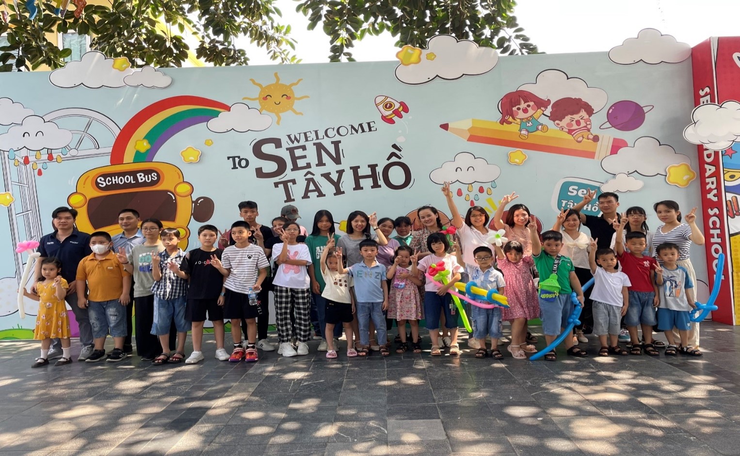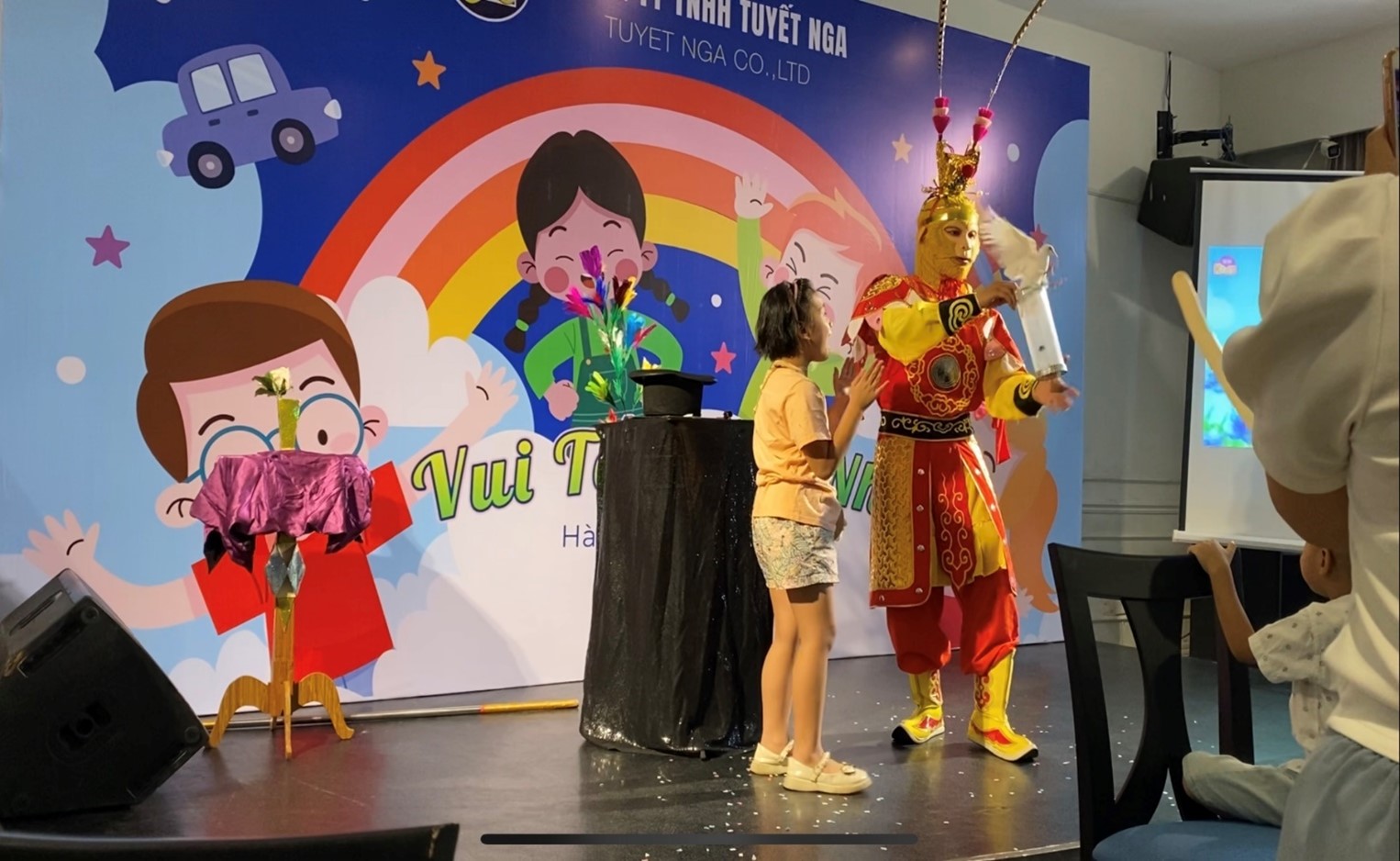 Buổi lễ khép lại với bữa tiệc náo nhiệt tại Nhà hàng Sen Tây Hồ, nơi các bé được giao lưu các nghệ sĩ xiếc và ảo thuật.